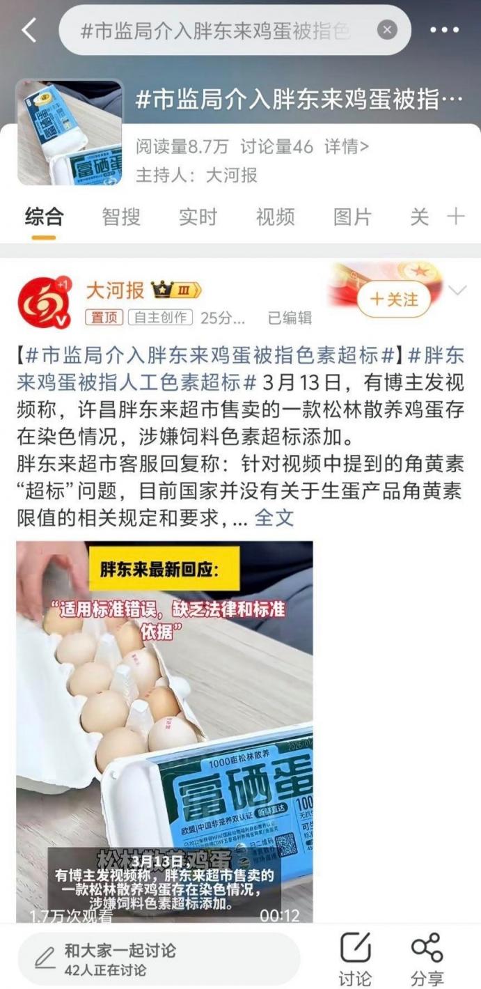 果不其然,胖东来分配资产的消息发布不久,就传出“胖东来鸡蛋色素超标”的新闻。